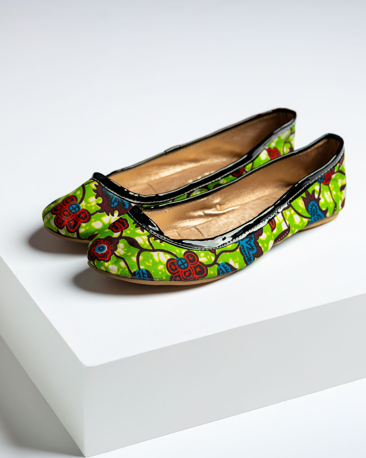 ABOKUMA Flatties are designed to bring color, culture, and confidence to every stride. Wrapped in vibrant African print, the bold patterns burst with life—rich greens, warm reds, and golden accents blending beautifully to create a look that’s both timeless and striking.